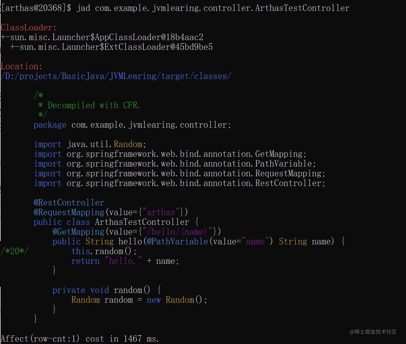 jad com.example.jvmlearing.controller.ArthasTestController就可以反编译出来对应的类了。通过反编译也能确定写的方法或者类是否生效。