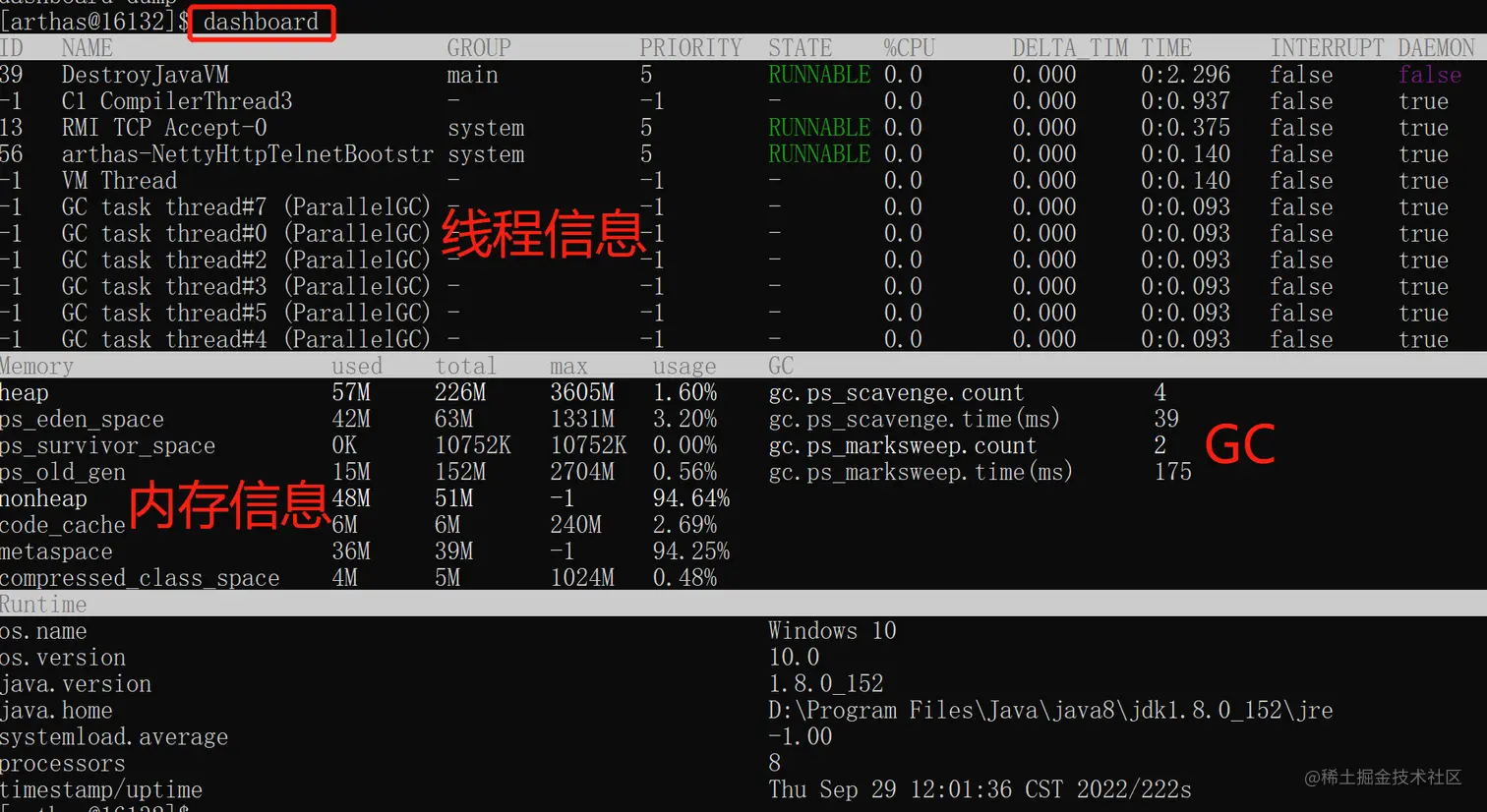 dashboard:当前系统的实时数据面板,每隔5秒钟刷新一次。使用q键或者Ctrl+c可以退出刷新