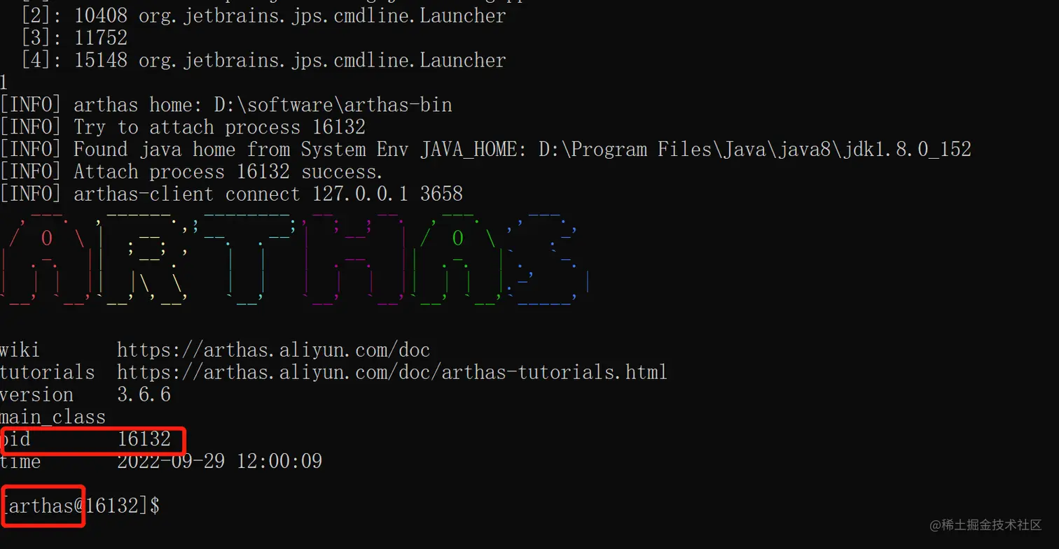 上图界面的意思是让我们选择一个java进程,然后回车。我们这里选择1,然后回车,看到如下界面表示启动arthas-boot成功,接着就可以尽情使用arthas的命令了。