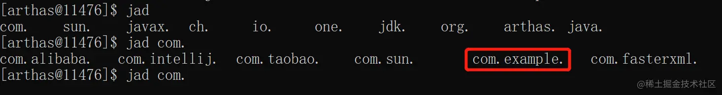 如果是忘记了要编译的类在哪个包下面,输入jad命令之后再按tab键,arthas会自动项目都有哪些包给一层层展示出来。