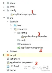 首先,当我们创建一个 Spring Boot 工程时,默认 resources 目录下就有一个 application.properties 文件,可以在 application.properties 文件中进行项目配置,但是这个文件并非唯一的配置文件,在 Spring Boot 中,一共有 4 个地方可以存放 application.properties 文件。