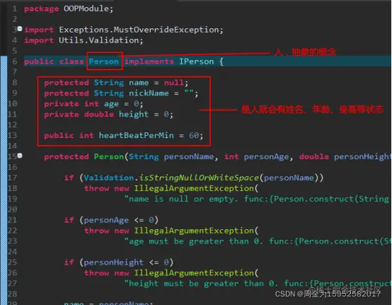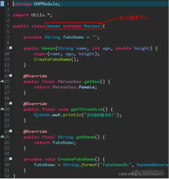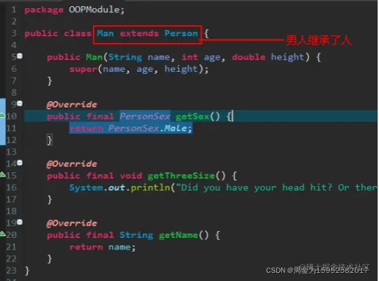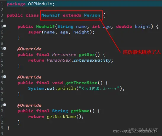 上面代码中的三个类:男,女和伪娘表示的三个东西(姑且称它们为东西)有着很多相同的状态和行为,如这三个东西都包含有姓名,年龄,身高,性别等。将这些相同的状态和行为进行二次拼装后我们给定了这样一个概念:人,人就是男,女,伪娘的抽象。我们可以说男是人,女是人,伪娘是人。