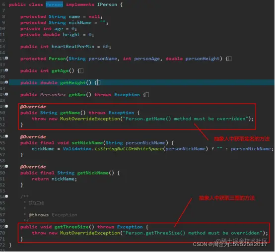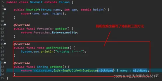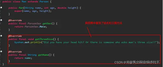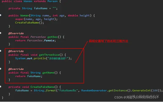 上述代码中同样是人在报名字和三围,每个人的反应都不太一样。这就是多态性的功劳。具现如果对抽象中的某些状态(变量)或行为(方法)进行了重写(覆盖),那即使是使用抽象来调用这些状态或行为,表现出的逻辑也是具现中的逻辑。简单的说就是只要被重写了,抽象中的逻辑就不作数了。