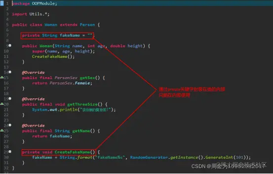 类的封装性就是“将某些不希望类外部获悉具体实现的变量(状态)或方法(行为)通过关键字private封装在类内部,使其只能在类的内部进行操作”这样一种特性。上面的代码中的变量fakeName和方法CreateFakeName()由于其标识为private只能在Woman类内部使用,这就是类的封装性。