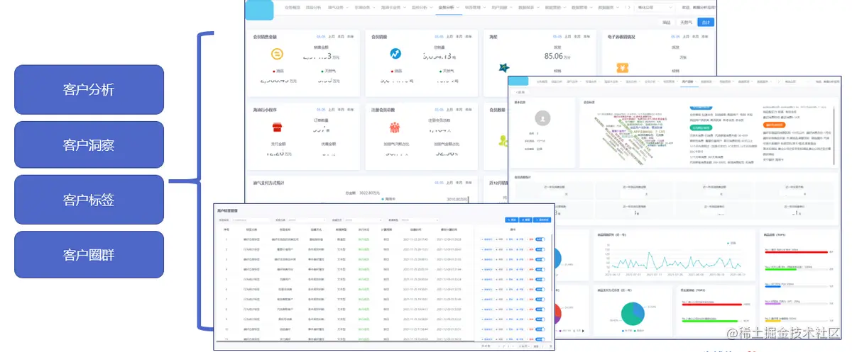 汇聚各方面经营数据,针对加油站油品、非油品业务开展进、销、存、量、价等业务、财务全方位分析,为企业管理者绩效管理、经营决策等提供支持。从客户基本属性、消费行为等维度全面分析,通过大数据技术,基于客户生命周期模型及算法模型等,生成用户画像和标签,实现客户360度洞察。