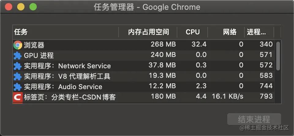 首先,可以看到,浏览器打开一个标签页,在任务管理器有四种进程: