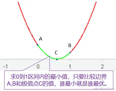 我们可以把0和1作为边界,问题就转化成有边界的线性拟合,最优解一定会在边界或者是线性拟合结果处。把问题简单化以后就是我们中学时期解的二元一次函数在指定范围内的最大或最小值问题,如下图: