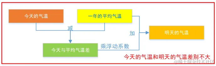今天的气温和明天差别不大,可以把今天和一年的平均气温之差作为计算明天气温的参考,如下图:
