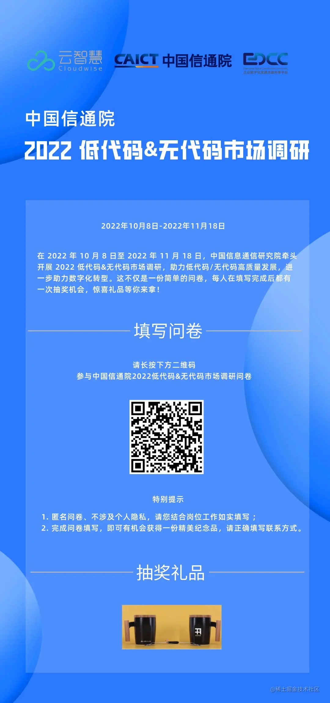 市场调研将于2022年11月18日截止,调研结果将以《2022低代码市场调研报告》和《2022无代码市场调研报告》的形式公布。