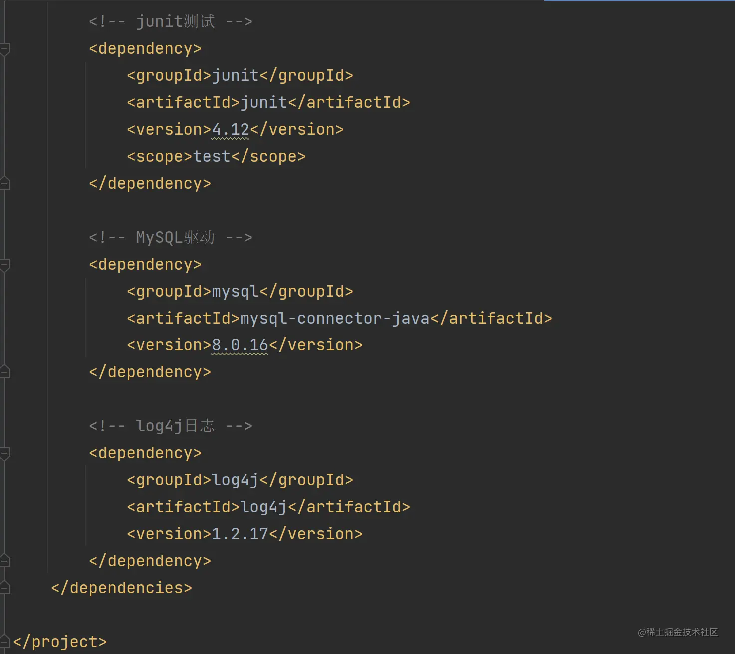 目前4种依赖:Mybatis , log4j ,mysql , junit