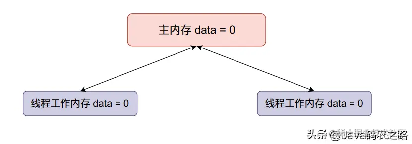 - 主内存data的初始值等于0,两个线程得到的data初始值都等于0。