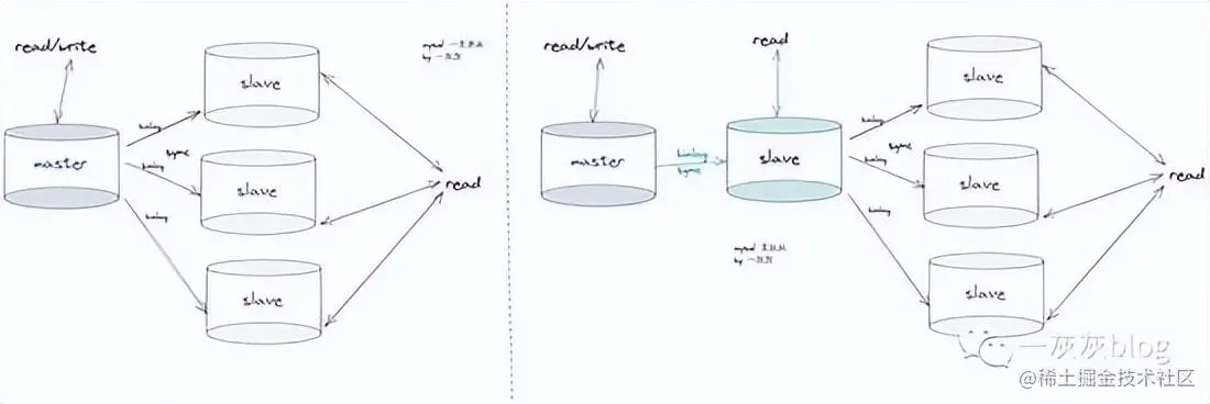 主从架构可以区分为:一主多从 + 一主一从再多从,以mysql的主从架构模型为例进行说明
