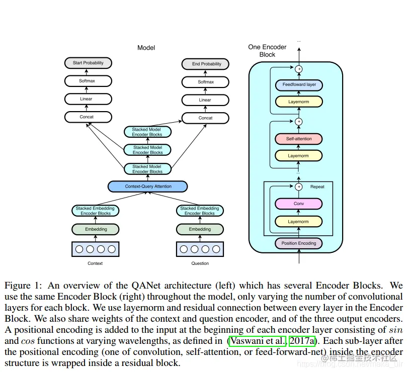 在本文中,为了使机器理解更高效,我们提出去掉这些模型的循环性质,仅将卷积和自注意力作为编码器的构成模块,分别对问题和文章进行编码。然后,我们通过标准注意力(Xiong et al., 2016; Seo et al., 2016; Bahdanauet al., 2015)来学习文章和问题之间的交互。在最终对每个作为答案范围的开始或结束位置的概率进行解码之前,用我们的无循环编码器再次对结果表征进行编码。我们将该架构称为QANet。 如图1所示:
