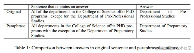 对于文档释义步骤,我们首先将段落分割成句子,分别进行释义。我们用k = 5,所以每个句子有25个意译选项。一个新的文档d0是通过简单地用随机选择的意译替换d中的每个句子而形成的。一个明显的问题与这个方法最初的回答在d0可能不再存在。答案提取解决了上述问题。让我们以包含原答案a的原句为例,以s0为释义。我们用简单的启发式来识别新释义的答案如下。计算s0中每个单词与a的开始/结束单词之间的字符级2克分数,找出s0中可能答案的开始和结束位置。在所有转述答案中,选择字符2克分数最高的一个作为新的答案a0。表1显示了这个过程找到的新答案的示例。