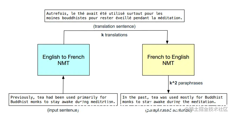 我们的释义过程如下,假设法语是一种关键语言。首先,我们将输入序列输入到英法模式的波束译码器中,得到k个法文翻译。然后将每一个法文翻译通过反向翻译模型的波束译码器,得到输入序列的共k2个释义。