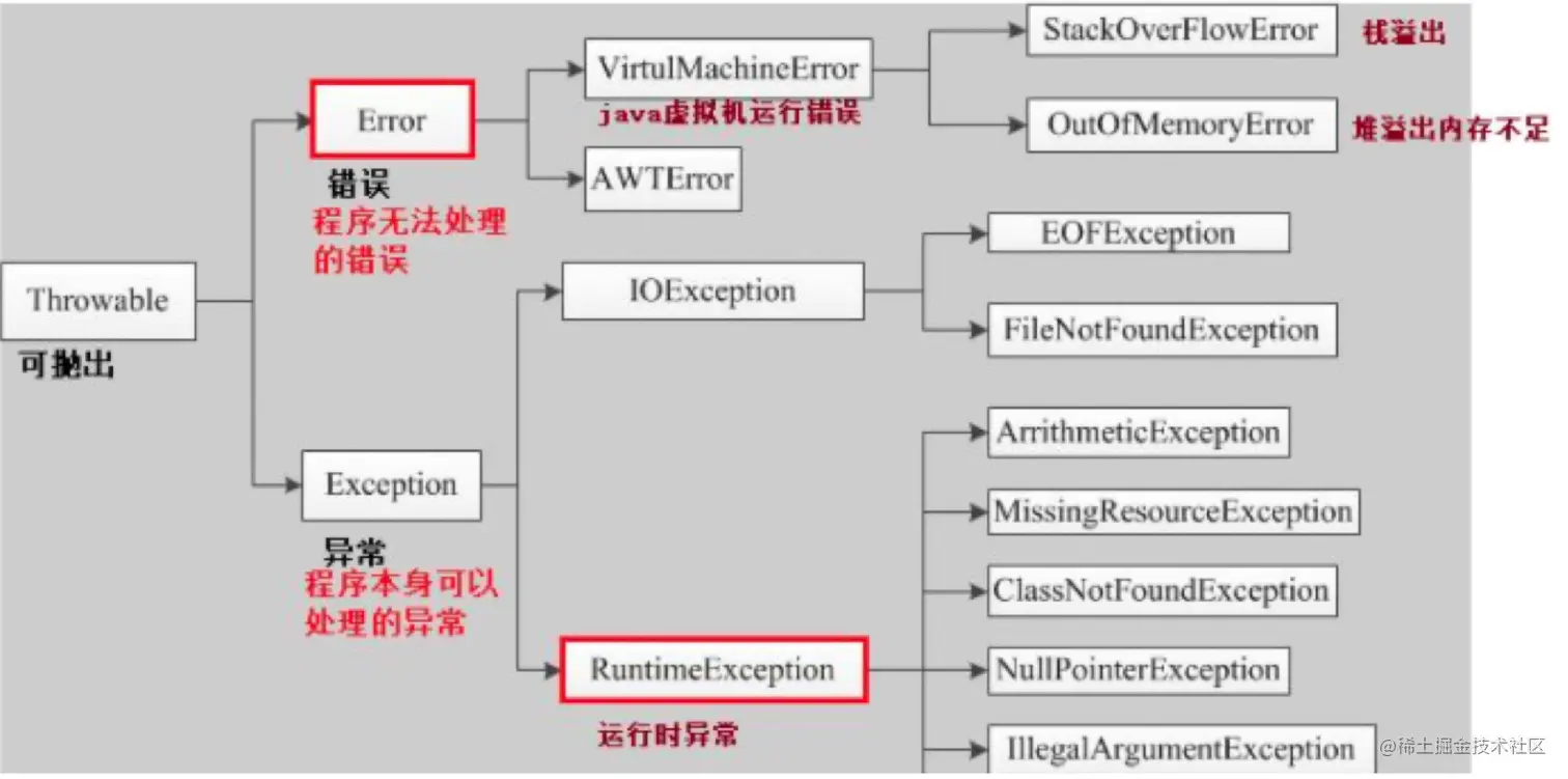 - Error一般是与JVM相关的问题,如系统崩溃、内存不足等,比如OutOfMemoryError。这类错误仅靠程序本身无法恢复;Exception表示程序可以处理的异常。