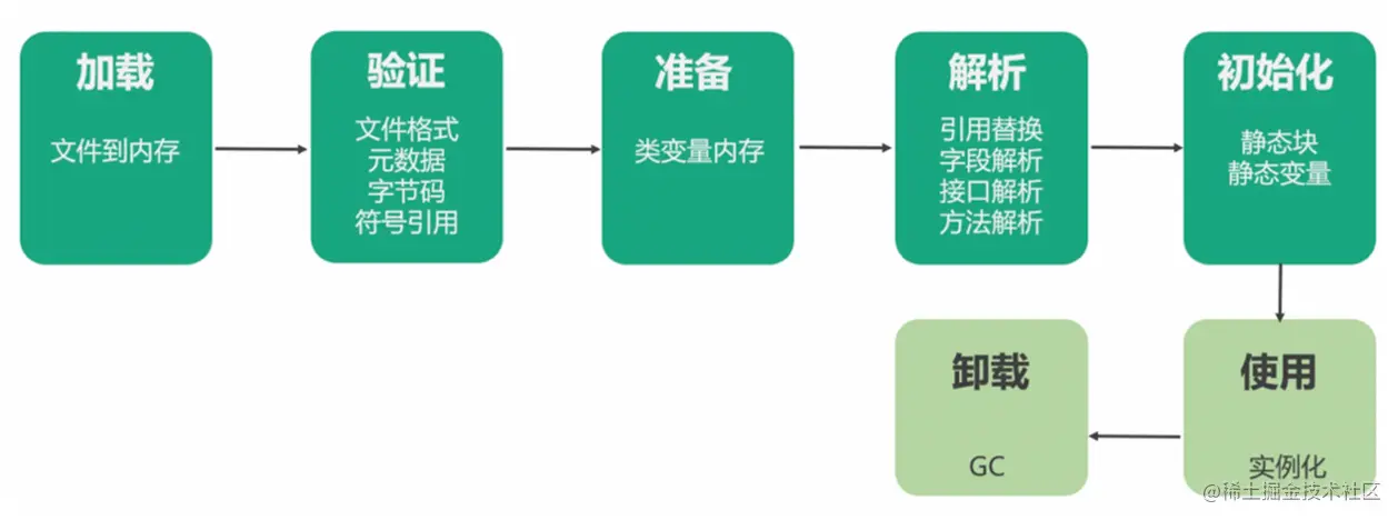 - 加载:类加载器负责根据类的全限定名来读取此类的二进制字节流到JVM内部,然后将其转换为对应的java.lang.Class对象实例