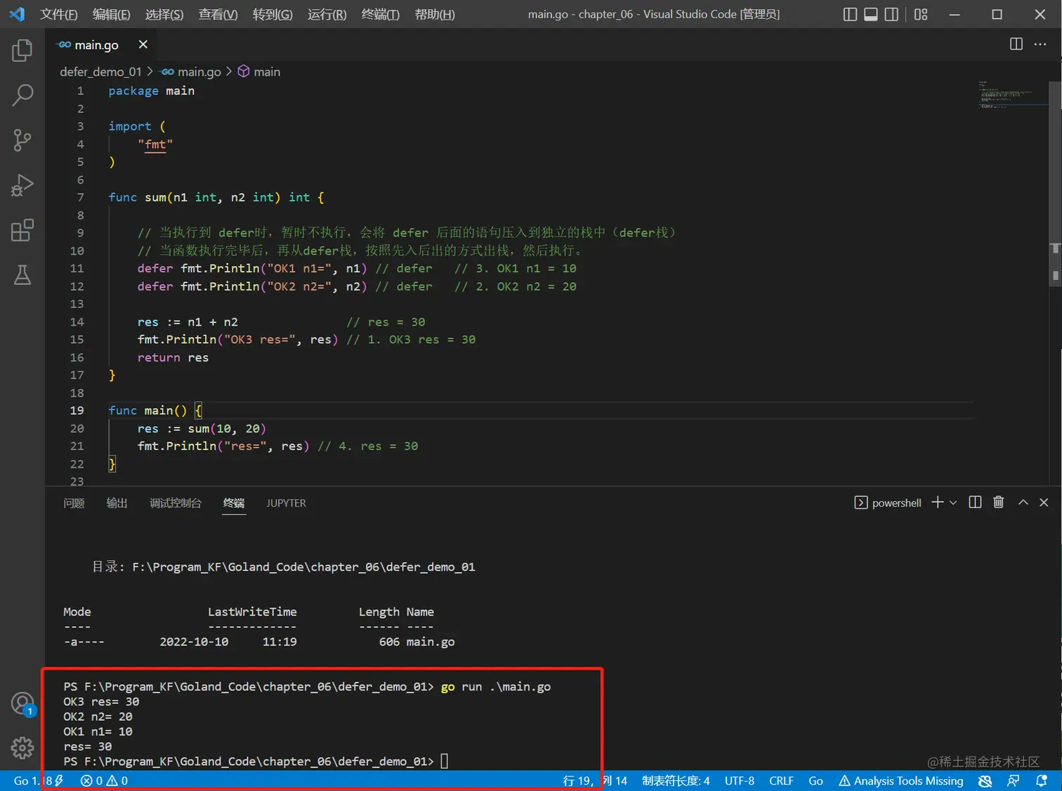 fmt.Println("res=", res) // 4. res = 30