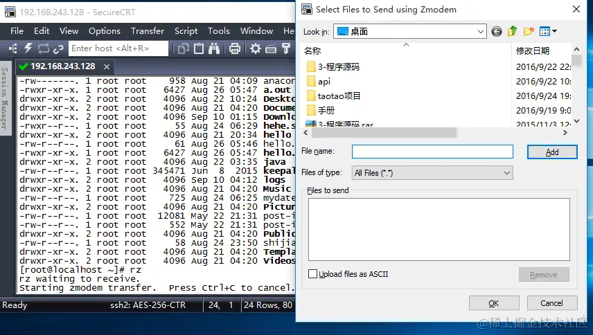 然后就可以直接在secureCRT中输入rz,再按回车,就会出现选择框,这时你可以选择文件上传了