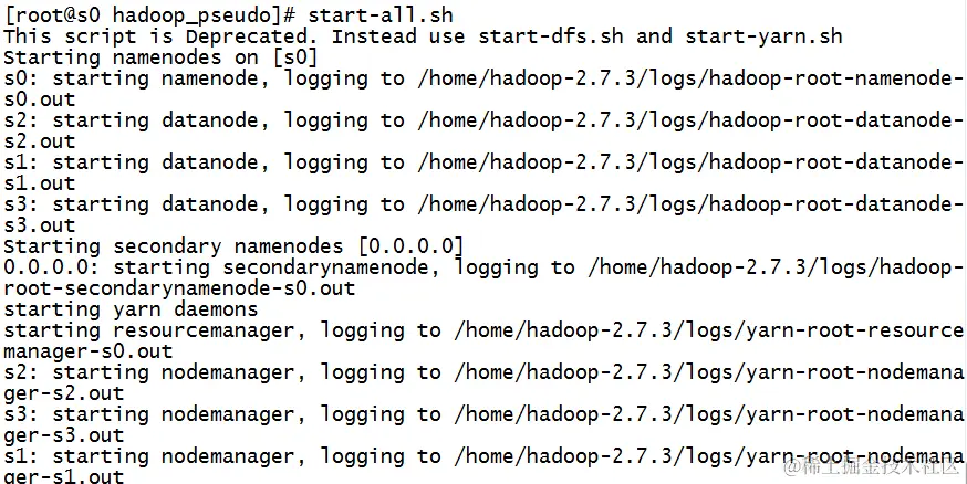 7、先格式化,hadoop namenode -format,再启动守护线程,先输入 start-dfs.sh再输入 start-yarn.sh最后输入(这个可以不启动) mr-jobhistory-daemon.sh start historyserver,或使用start-all.sh一键启动,不过官方已经不推荐这么用了。(注意:这样是启动不了的,因为前面我们修改了默认的配置的文件,我们真正进行了配置的文件是hadoop_conf)