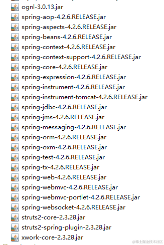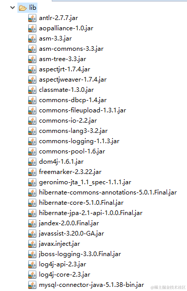 一、引入Struts的jar包,spring的jar包,hibernate的jar包,Apache的一些jar包,还有加入struts2-spring-plugin-2.3.28.jar这个插件jar包,截图如下: