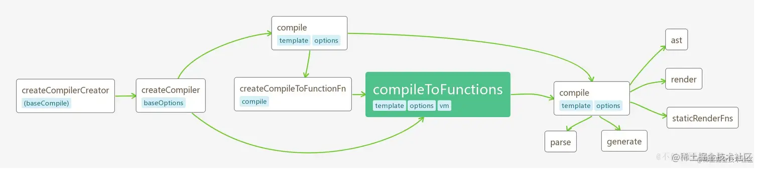 接下来,我们分析一下compileToFunctions的实现逻辑。在判断不使用缓存的编译结果后,compileToFunctions会执行compile方法,这个方法是前面分析createCompiler时,返回的内部compile方法,所以我们需要先看看compile的实现。