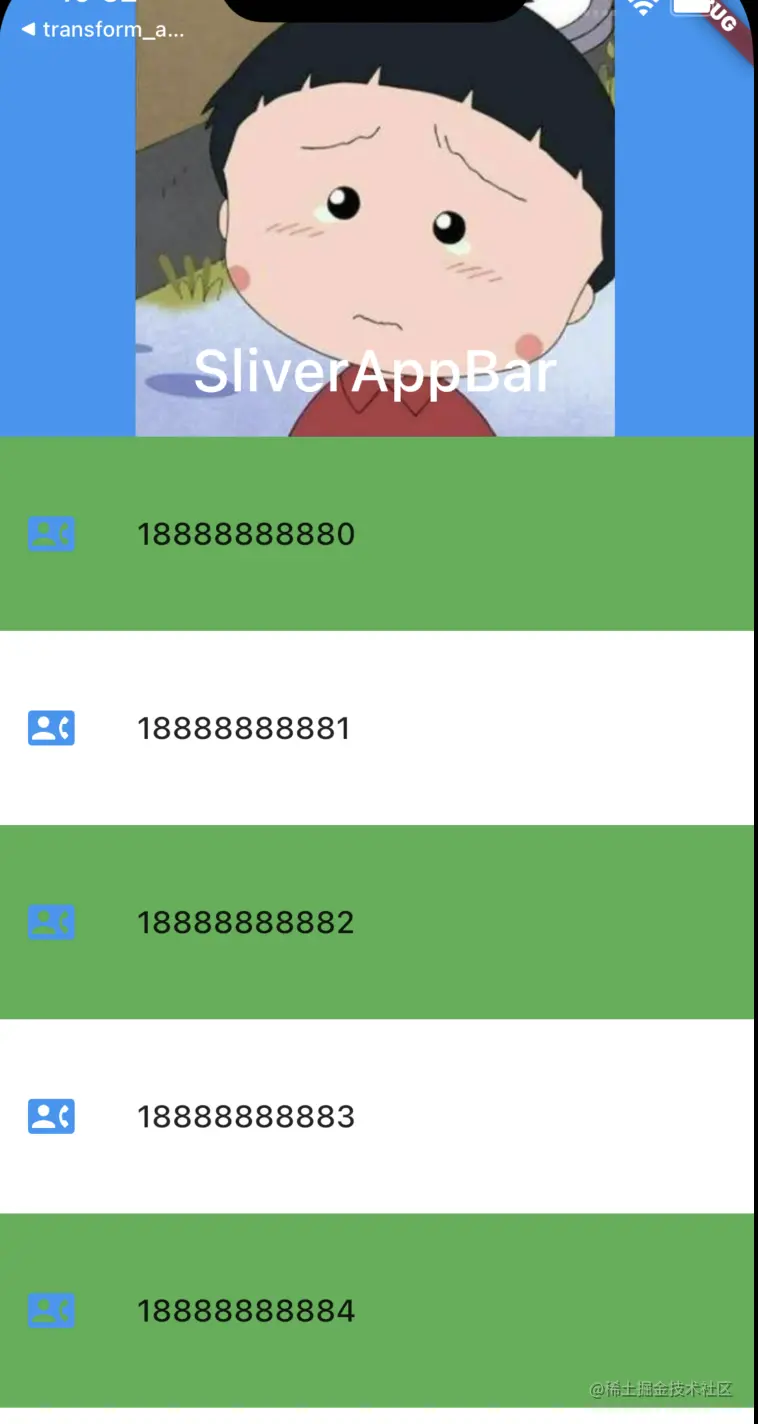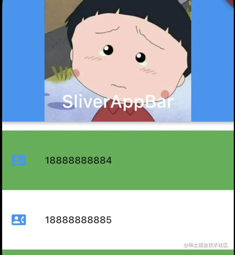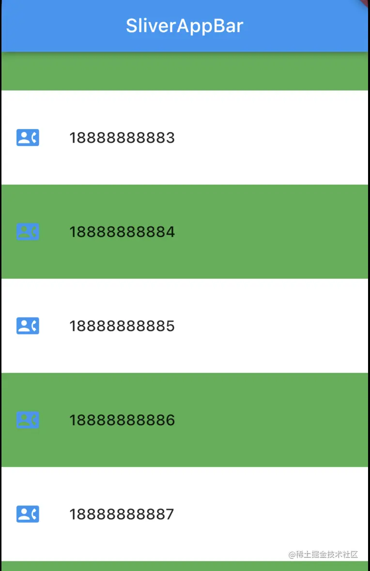 默认情况下SliverAppBar是展开状态,如果我们将下面的SliverList向上滑动,flexibleSpace就会被隐藏,我们可以得到下面的界面: