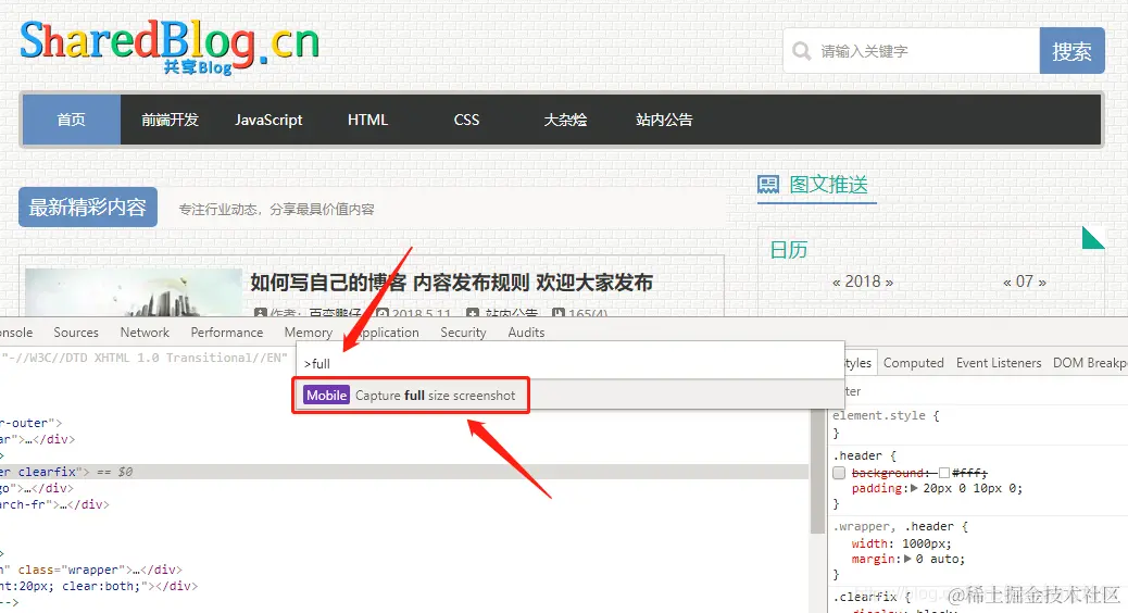 用谷歌浏览器打开你需要截图的网站,等待网站加载完毕,然后鼠标右击“检查”,或者直接快捷键 F12 打开审查元素,接着我们 Shift+Ctrl+P 会出现一个输入框,我们输入“full”,如下图: