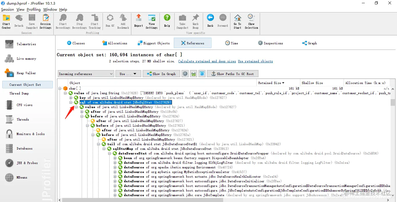 观看char[],大部分均是insert 语句 ,猜测应该 druid 数据源,开启了监控功能