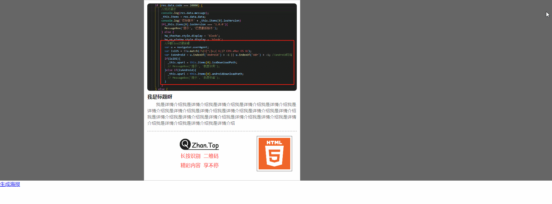 发现的坑,生成时候,文字内容有空格,无法识别,还需要 才可以;本来文字详情区域,我用css写了多行显示省略号,不支持,生成图片之后为空白,如果需要实现,请使用js自行写吧。