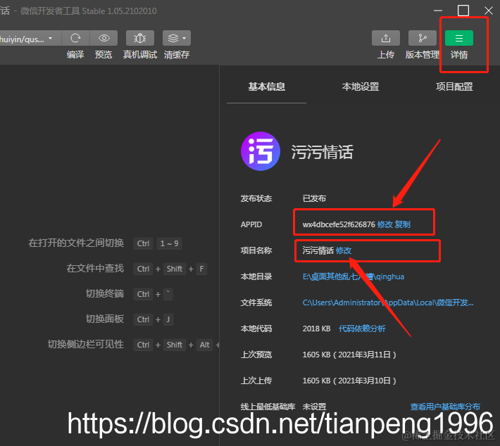 接着在开发工具右上角 详情 修改APPID 和 项目名称