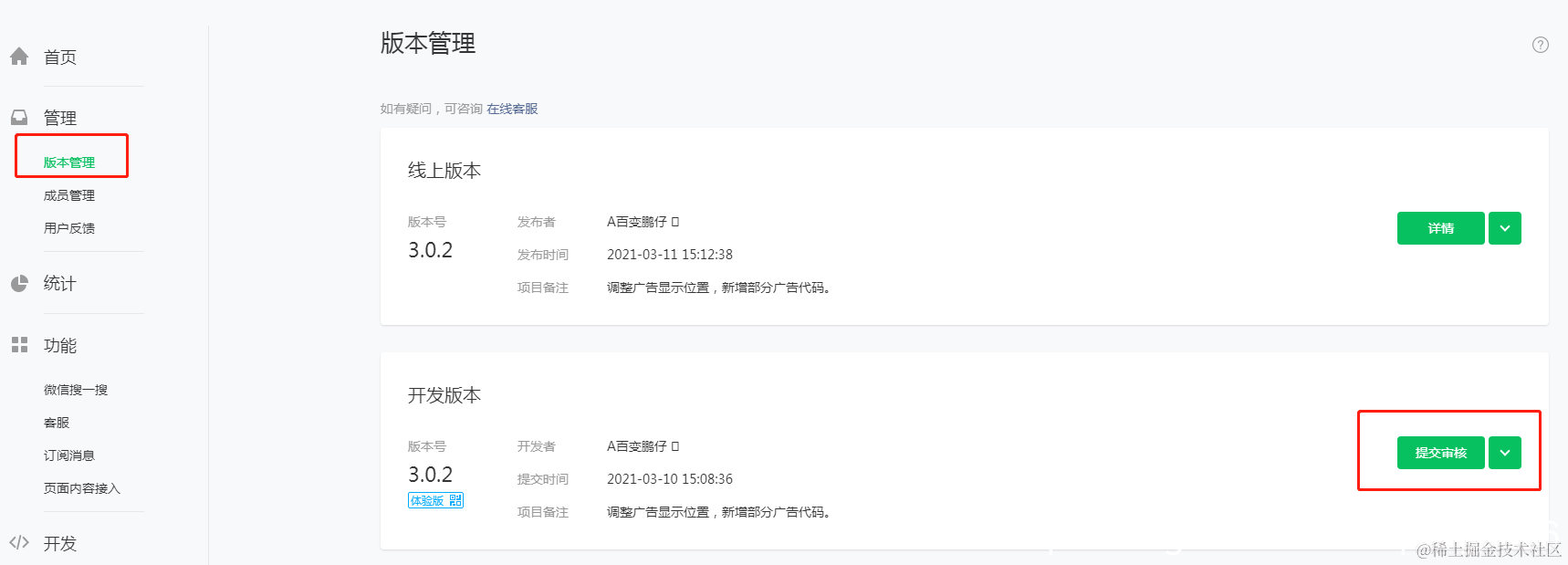 正常后,我们在小程序后台管理 - 版本管理 - 提交审核