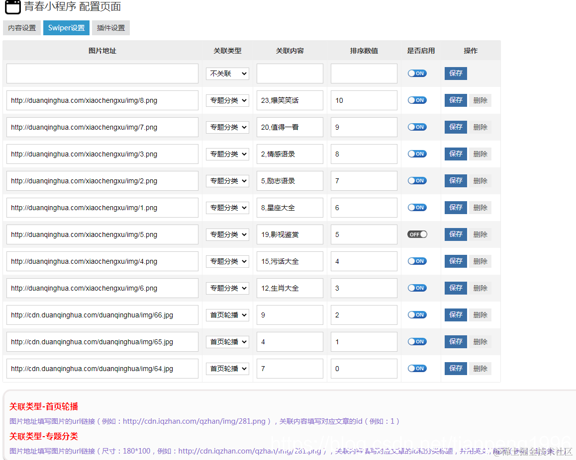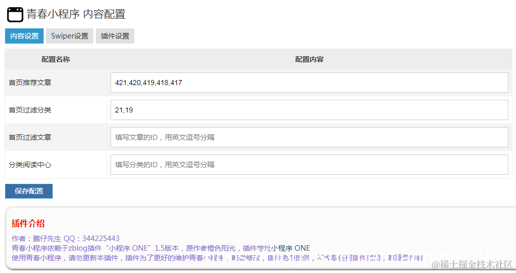 再发布之前,我们在网站后台管理 - 插件管理 - 青春小程序设置