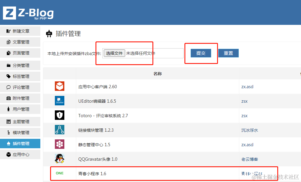 首先,登录自己的网站后台,将 青春小程序插件.zba 上传至后台插件并开启