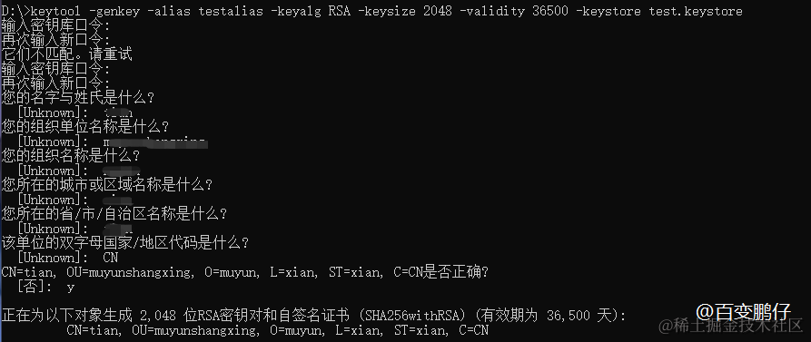 test.keystore是证书文件名称,可修改为自己想设置的文件名称,也可以指定完整文件路径