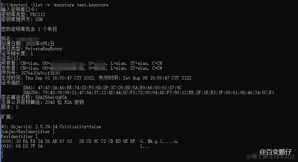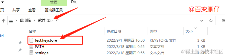 等上方信息输入完成后,会在D盘中生成证书,路径为“D:\test.keystore”