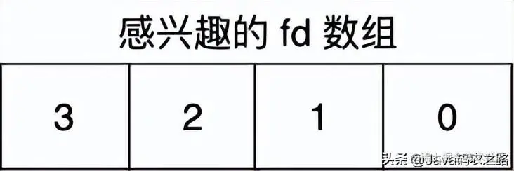 即 readset 为 {1, 0,0, 1},在调用 select 后会将 readset 传给内核,如果内核发现 listenfd 有连接已就绪的事件,则内核也会在将相应位置置 1(其他无就绪事件的 fd 对应的位置为 0)然后会回传给用户线程,此时的 readset 如下,即 {1,0,0,0}