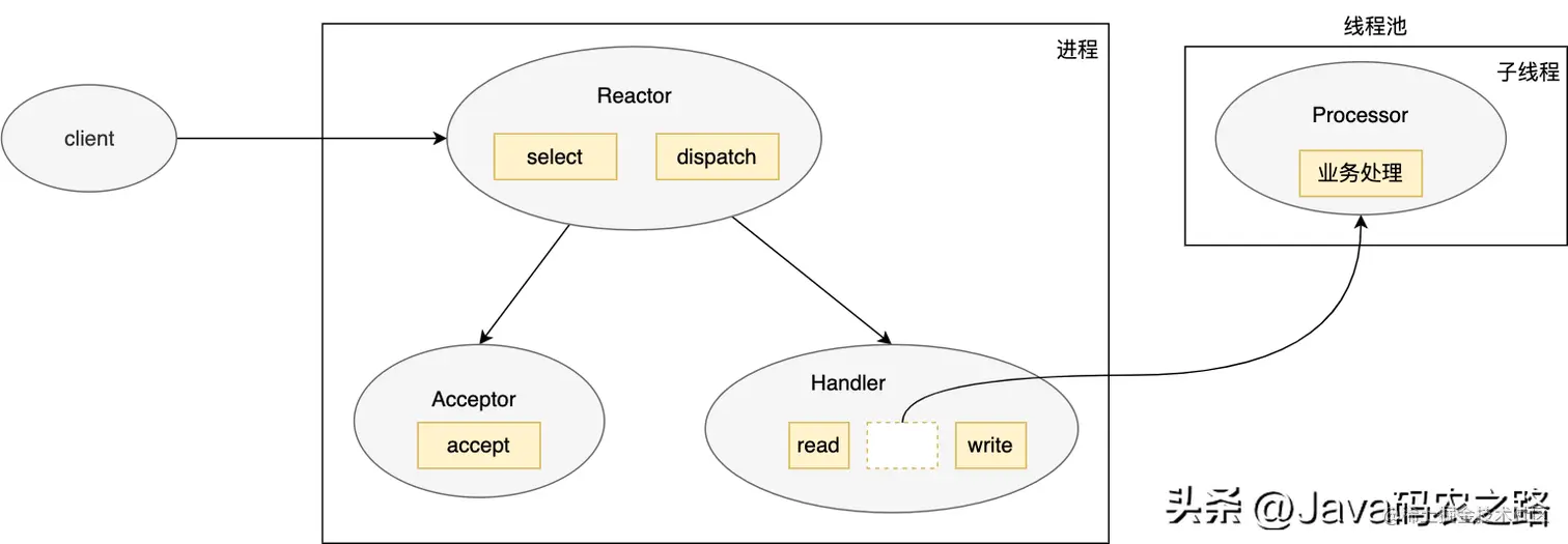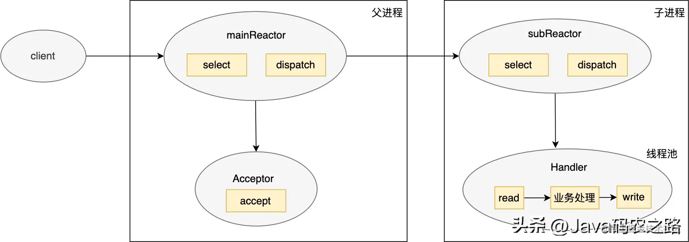 - 主进程主要负责 accept 连接,接收后会将其传给 subReactor,subReactor 将其连接加入连接队列中来监控其事件