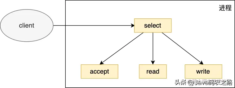 主要流程如下:调用 select 来监听连接,读写事件,收到事件后判断是否是监听 socket 上的事件,是的话调用 accept(),否则判断是否是已连接 socket 上的读写事件,是的话调用 read(),write()