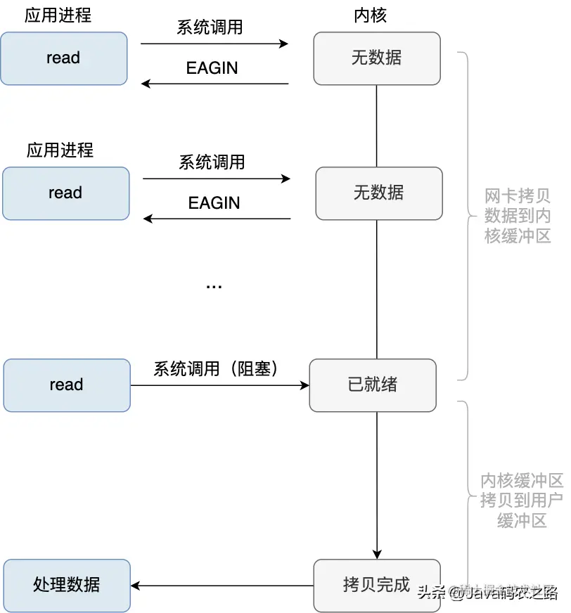 这样的话调用 read 就不会阻塞等待而会马上返回了,也就实现了非阻塞的效果,不过需要注意的,我们这里说的非阻塞并非严格意义上的非阻塞,这里的非阻塞只是针对网卡数据拷贝到内核缓冲区这一段,如果数据就绪后,再执行 read 此时依然是阻塞的,此时用户进程会占用 CPU 去把数据从内核缓冲区拷贝到用户缓冲区中,可以看到这种模式是同步非阻塞的,这里我们简单解释下阻塞/非阻塞,同步/非同步的概念