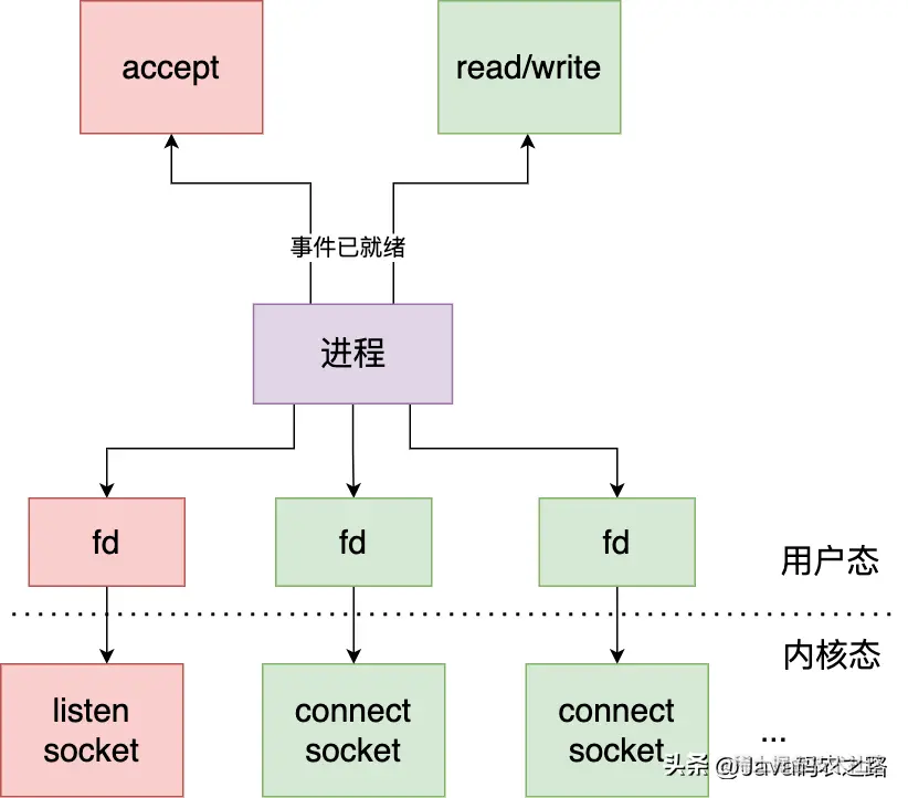 于是 IO 多路复用模型诞生了,它是指用一个进程来监听 listen socket(监听 socket) 的连接建立事件,connect socket(已连接 socket) 的读写事件(读写),一旦数据就绪,内核就会唤醒用户进程去处理这些 socket 的相应的事件