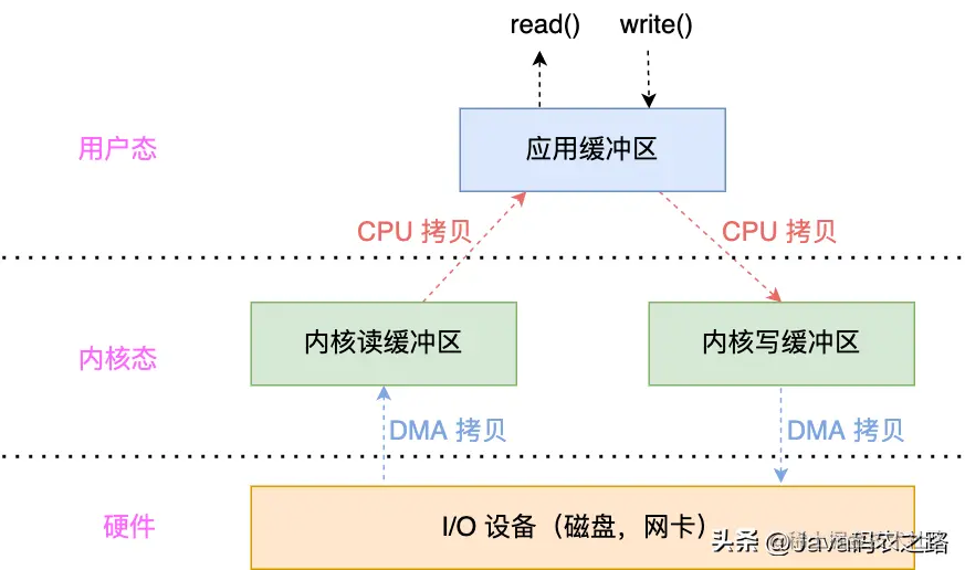 - 当执行 write() 时,会将数据从应用缓冲区拷贝到内核写缓冲区,然后再通过 DMA 拷贝将数据从写缓冲区发送到设备上传输出去,如果写缓冲区满,则 write 会阻塞等待写缓冲区可写