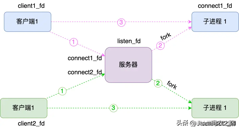 如果 server 是单进程,阻塞显然会导致 server 无法再处理其他 client 请求了,那我们试试把 server 改成多进程的?只要父进程 accept 了 socket ,就 fork 一个子进程,把这个 socket 交给子进程处理,这样就算子进程阻塞了,也不影响父进程继续监听和其他子进程处理连接