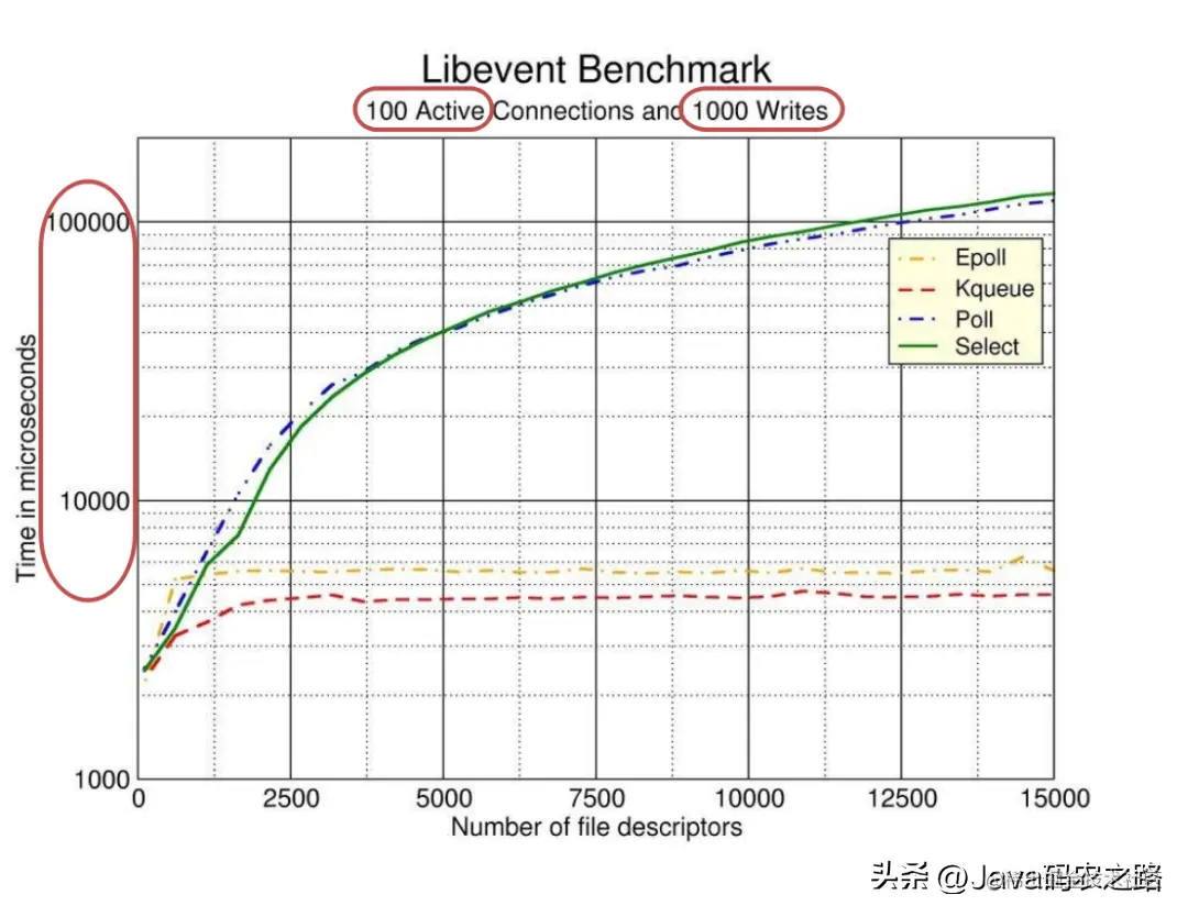 既然 epoll 这么好,那么它的性能到底比 select,poll 强多少呢,关于这一点,我们最好做对其进行做下压测,我们来看下 libevent 框架对 select,poll,Epoll,Kqueue(可以认为是 mac 下的 epoll)的压测数据