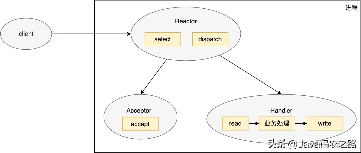 - Reactor 对象首先调用 select 来监听 socket 事件,收到事件后会通过 dispatch 分发
