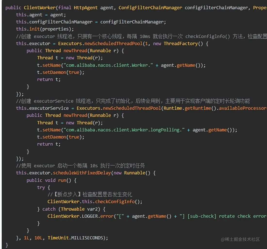 进入 ClientWorker.ClientWorker() 构造方法,主要是创建了两个定时调度的线程池,并启动一个定时任务;