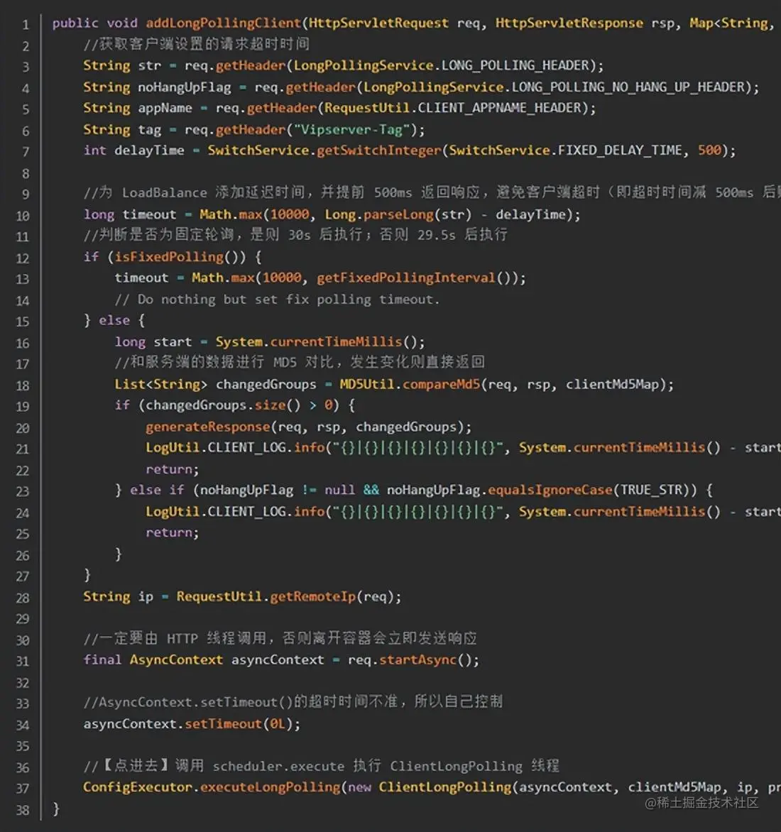 LongPollingService.addLongPollingClient() 方法,里面是长轮询的核心处理逻辑,主要作用是把客户端的长轮询请求封装成 ClientPolling 交给 scheduler 执行;