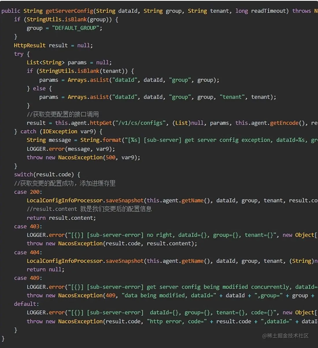 - 获得这些信息之后,在LongPollingRunnable.run() 方法中调用 getServerConfig() 去 Nacos 服务器上读取具体的配置内容;