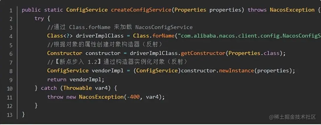 ConfigFactory.createConfigService(),发现其使用反射机制实例化 NacosConfigService 对象;