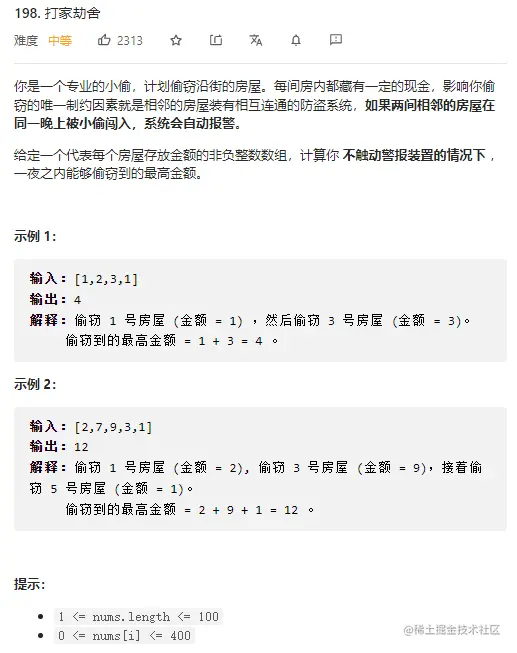 这是 力扣上的 198. 打家劫舍,难度为 中等。